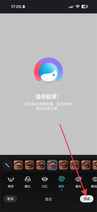 3、照片導(dǎo)入后,進(jìn)入美妝編輯界面,可選擇美妝功能對(duì)照片中的人物進(jìn)行美化,例如選擇喜歡的眼影樣式應(yīng)用。