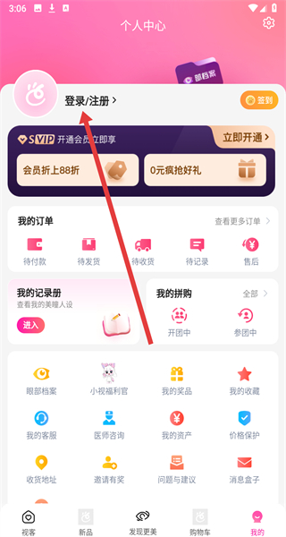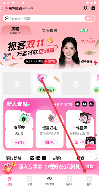 1、打開視客眼鏡網(wǎng)app,進(jìn)入首頁后,點(diǎn)擊底部導(dǎo)航欄最右側(cè)的我的選項(xiàng),進(jìn)入個(gè)人中心頁面。