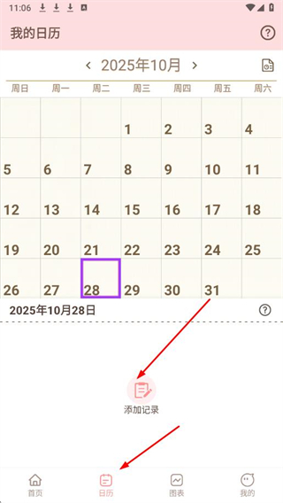 2、日歷板塊可查看我的日歷,選擇具體日期,如2025年10月28日,并能添加記錄,方便用戶記錄經(jīng)期相關(guān)情況。