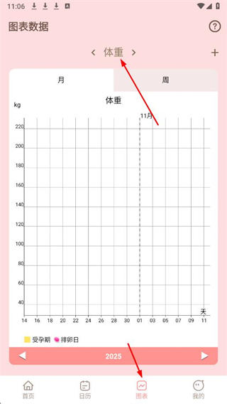 3、圖表板塊可查看體重等圖表數(shù)據(jù),有月、周視圖,還能顯示受孕期、排卵日等信息,幫助用戶直觀了解身體數(shù)據(jù)變化。