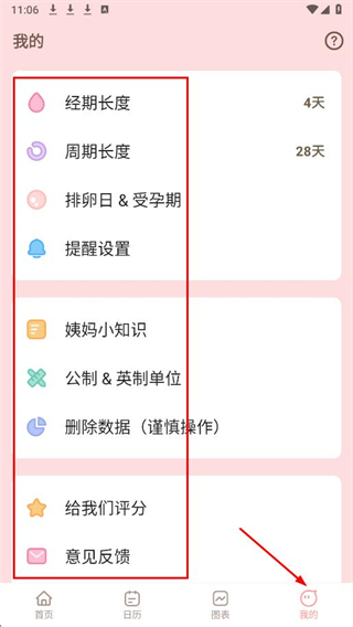 4、我的板塊可設(shè)置經(jīng)期長度、周期長度、排卵日&受孕期、提醒設(shè)置等,還有姨媽小知識(shí)、單位切換、數(shù)據(jù)刪除、評(píng)分、意見反饋等功能。