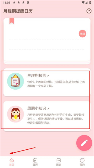 1、首頁功能豐富,有生理期報(bào)告和周期小知識(shí)板塊,生理期報(bào)告可對(duì)比周期、預(yù)測(cè)信息,周期小知識(shí)提供經(jīng)期注意事項(xiàng)等內(nèi)容。