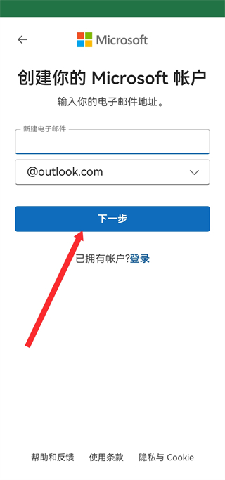 4、在頁面輸入電子郵箱地址,點擊下一步,按照后續(xù)提示完成賬戶創(chuàng)建即可。