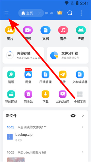 1、在文件管理界面,點(diǎn)擊左上角菜單按鈕,展開(kāi)功能列表。