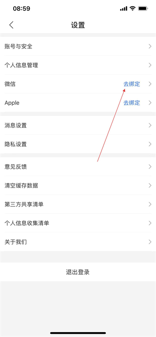 3、在設(shè)置頁(yè)面點(diǎn)擊微信選項(xiàng),右側(cè)的去綁定,完成微信綁定。