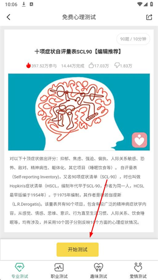 免費(fèi)心理測(cè)試APP支持永久免費(fèi)心理測(cè)試。為大家提供了專業(yè)測(cè)試、情感測(cè)試、職業(yè)測(cè)試。還有心理專家在線為你一對(duì)一指導(dǎo),數(shù)十萬網(wǎng)友互助問答!