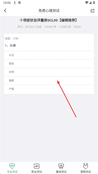 3、按照測(cè)試題目,從選項(xiàng)中選擇符合自身情況的選項(xiàng),依次完成所有題目,即可完成心理測(cè)試。