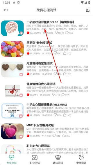 1、打開免費(fèi)心理測(cè)試APP,在測(cè)試列表中選擇想要進(jìn)行的心理測(cè)試。