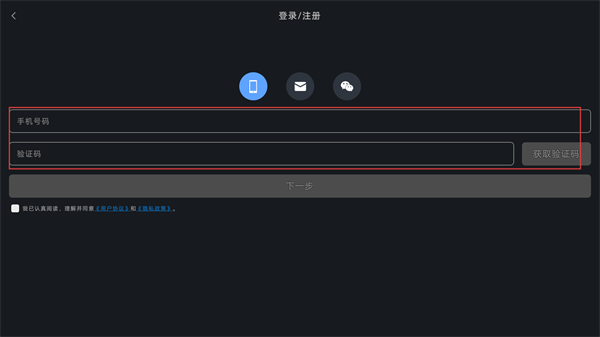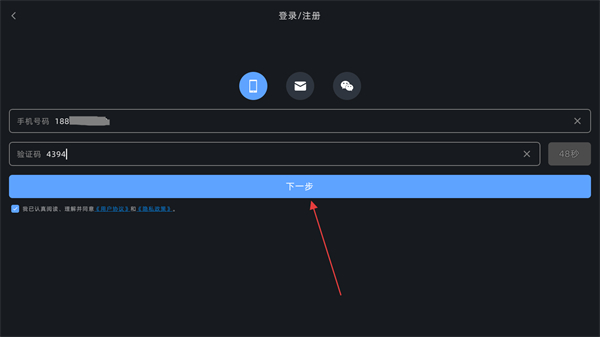 4、勾選《用戶協(xié)議》和《隱私政策》,然后點擊下一步即可登錄。