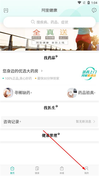 1、打開阿里健康A(chǔ)PP,點擊導(dǎo)航欄中的我的。