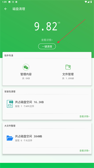 3、在該頁(yè)面內(nèi),點(diǎn)擊一鍵清理的按鈕即可開(kāi)始清理。