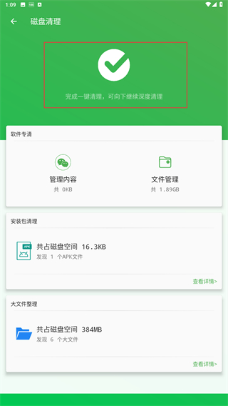 4、清理完成后,會(huì)顯示打鉤的圖標(biāo),并提示向下滑動(dòng)可深度清理。