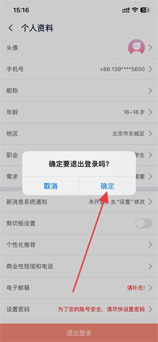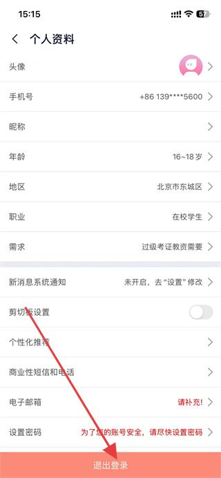 3、在個(gè)人資料頁(yè)面底部,找到并點(diǎn)擊退出登錄按鈕。