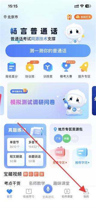 1、打開暢言普通話app,點(diǎn)擊底部導(dǎo)航欄的我的選項(xiàng)。