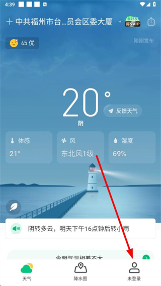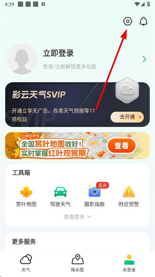 1、在彩云天氣app天氣頁面點擊右下方個人中心選項,進入個人頁面。