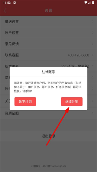 4、在注銷賬號(hào)確認(rèn)框中點(diǎn)擊繼續(xù)注銷按鈕,按提示完成賬號(hào)注銷流程。