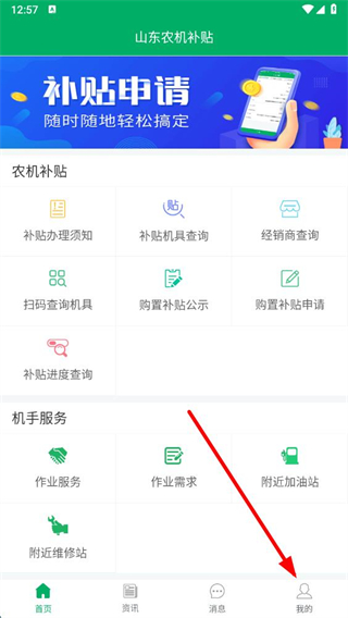 1、在山東農(nóng)機(jī)補(bǔ)貼app首頁點(diǎn)擊我的選項(xiàng),進(jìn)入個(gè)人頁面。