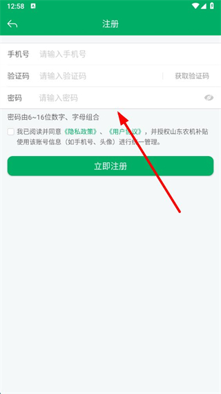 4、在注冊(cè)頁面輸入手機(jī)號(hào)、驗(yàn)證碼和密碼,勾選同意相關(guān)協(xié)議后點(diǎn)擊“立即注冊(cè)”按鈕,完成注冊(cè)操作。