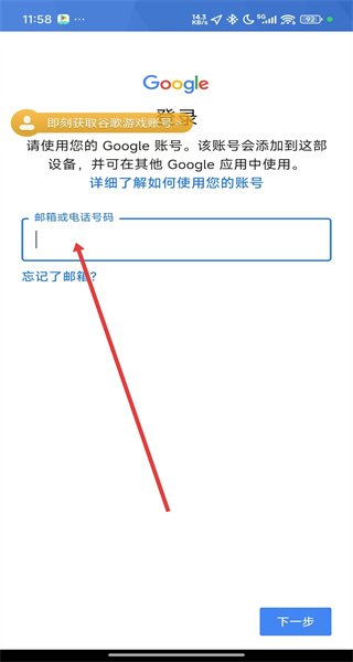 2、在跳轉(zhuǎn)到谷歌賬號登錄頁面中,可以點擊輸入框填寫谷歌郵箱進行登錄。