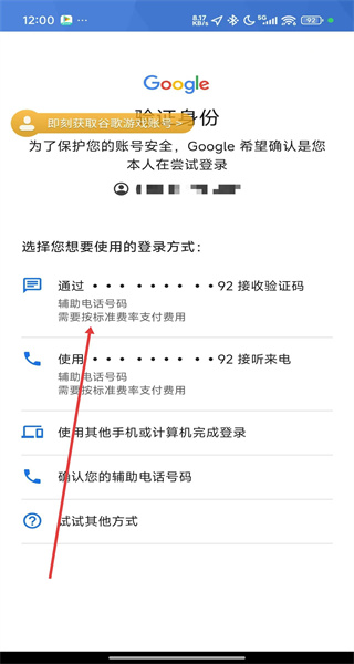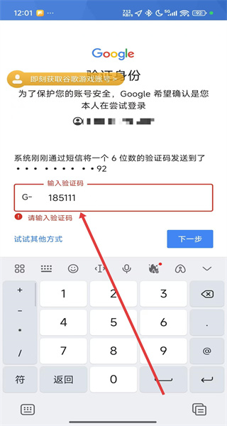 4、在進入到驗證碼輸入頁面中,點擊輸入框填寫接收到的驗證碼后,即可完成谷歌賬號登錄。