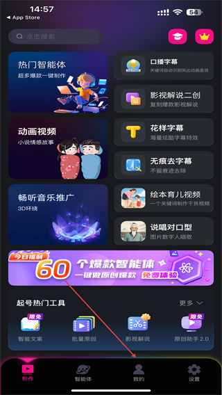1、啟動(dòng)美冊(cè)視頻制作的APP,進(jìn)入首頁點(diǎn)擊導(dǎo)航欄中我的。