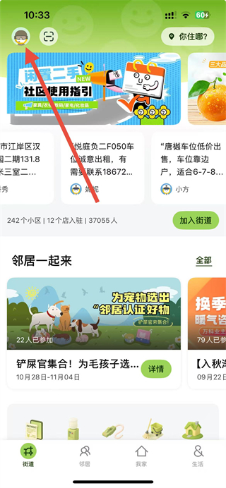 1、打開(kāi)住這兒APP,點(diǎn)擊左上角頭像進(jìn)入個(gè)人菜單頁(yè)面。