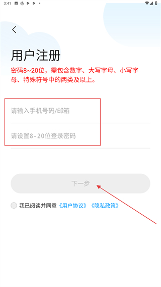 2、進入用戶注冊的界面內(nèi),輸入手機號、密碼,再點擊下一步。