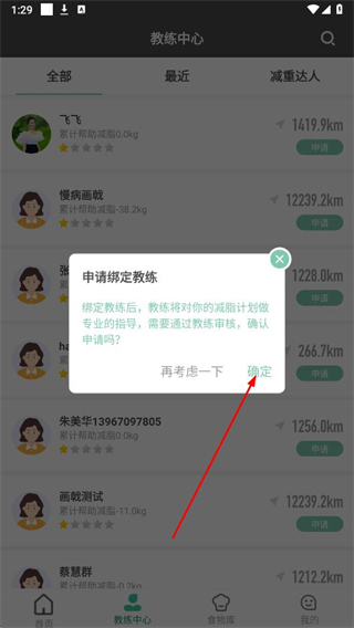 3、在彈出的申請綁定教練提示框中,點擊確定按鈕,等待教練審核通過,即可完成綁定。
