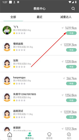 2、進(jìn)入教練中心頁面后,選擇想要綁定的教練,點擊其右側(cè)對應(yīng)的申請按鈕。
