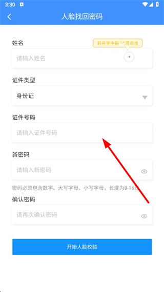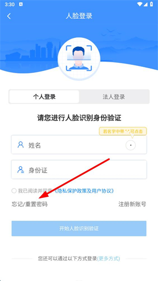 4、若選人臉識別找回密碼,輸入個人信息,點擊開始人臉校驗,按提示完成密碼重置。