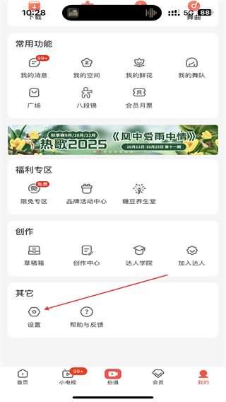 2、在我的頁面內(nèi),向下拉動,找到并點擊設(shè)置的按鈕。