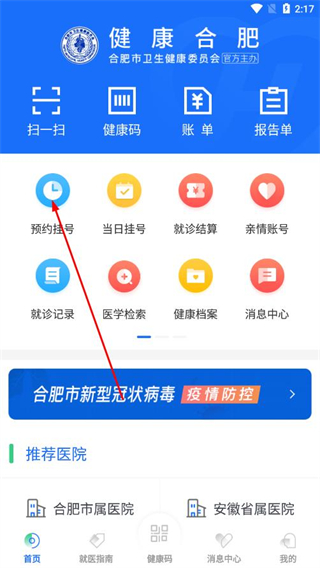 1、打開健康合肥APP,在首頁點(diǎn)擊預(yù)約掛號(hào)。