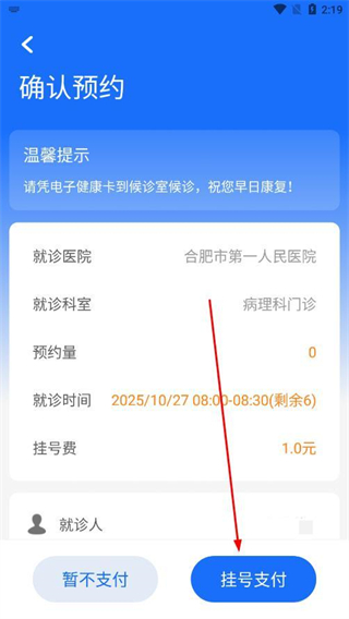 6、在確認(rèn)預(yù)約頁面,點(diǎn)擊掛號(hào)支付,完成掛號(hào)預(yù)約流程。