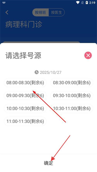 5、在請(qǐng)選擇號(hào)源頁面,選擇具體的就診時(shí)間段,點(diǎn)擊確定。