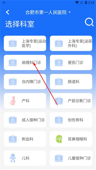 3、進(jìn)入選擇科室頁面,選擇具體科室,如病理科門診。