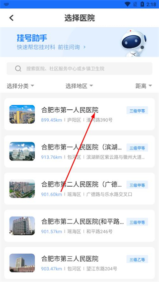 2、在選擇醫(yī)院頁面,選擇目標(biāo)醫(yī)院,如合肥市第一人民醫(yī)院。