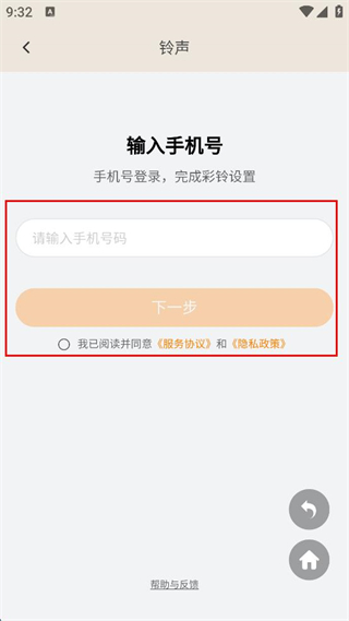 4、輸入手機號碼,同意服務協(xié)議和隱私政策,點擊下一步完成彩鈴設置。