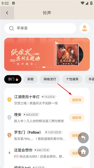 3、在鈴聲頁面選擇喜歡的鈴聲,點擊設彩鈴按鈕。