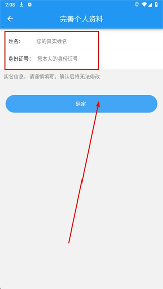 3、在完善個人資料頁面,填寫真實姓名和身份證號后,點擊確定,完成賬號注冊流程。