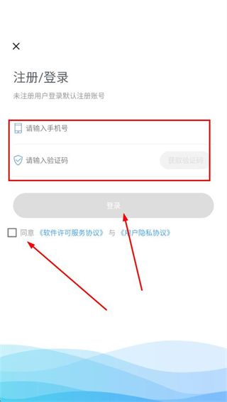 2、在注冊/登錄頁面輸入手機號、驗證碼,勾選協(xié)議后,點擊登錄,未注冊用戶將默認注冊賬號。