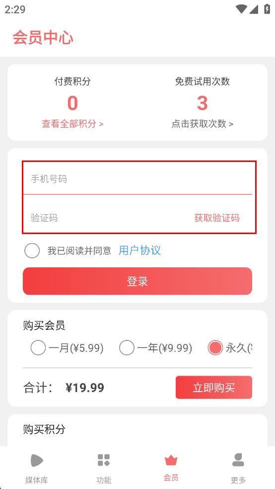 2、在會員中心輸入手機(jī)號碼,點擊獲取驗證碼并輸入。