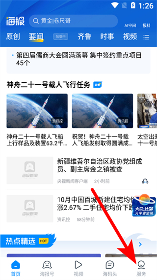 1、在海報新聞首頁,點擊右下角服務(wù)選項,進入服務(wù)頁面。