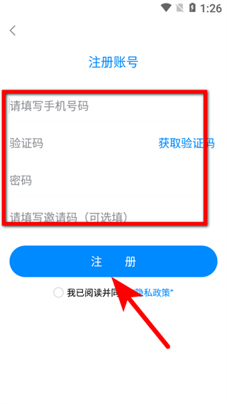4、在注冊賬號頁面,填寫信息并勾選協(xié)議后,點擊注冊按鈕,即可完成賬號注冊。