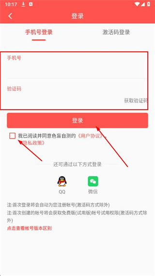 2、進入登錄頁面,選擇手機號登錄,輸入手機號、驗證碼,勾選同意用戶協(xié)議及隱私政策,點擊登錄按鈕,