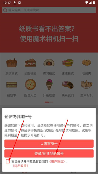 1、打開色盲自測app,在彈出的登錄或創(chuàng)建帳號提示框中,勾選用戶協(xié)議、隱私政策,點擊登錄/創(chuàng)建我的帳號。