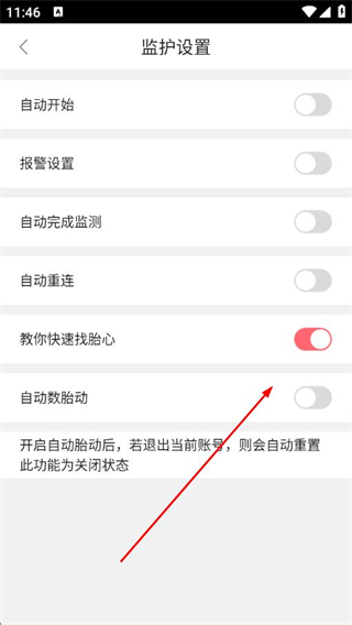 3、在監(jiān)護設(shè)置頁面找到自動數(shù)胎動,將其開關(guān)打開即可。