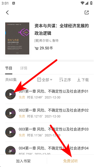 3、在書籍詳情頁面,選擇想聽的書、點擊免費試聽按鈕,進(jìn)入聽書播放頁面。