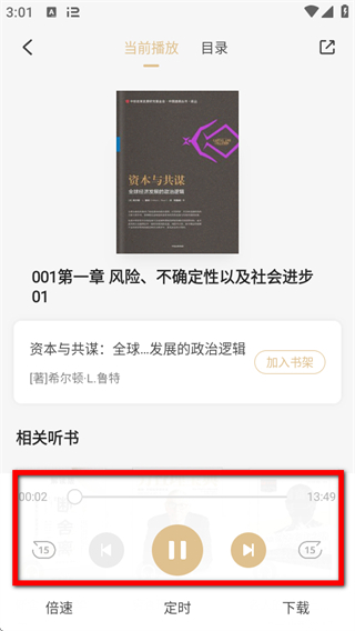 4、在聽書播放頁面,即可開始聽書,且可對播放進(jìn)行相關(guān)操作。