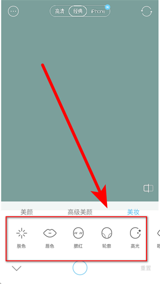 3、切換到美妝選項,可調(diào)整膚色、唇色、腮紅、輪廓、高光等美妝效果。
