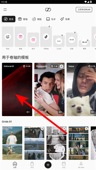 1.打開(kāi)Unfold軟件,在發(fā)現(xiàn)頁(yè)面選擇喜歡的模板,如用于卷軸的模板中的Editorial 01模板。